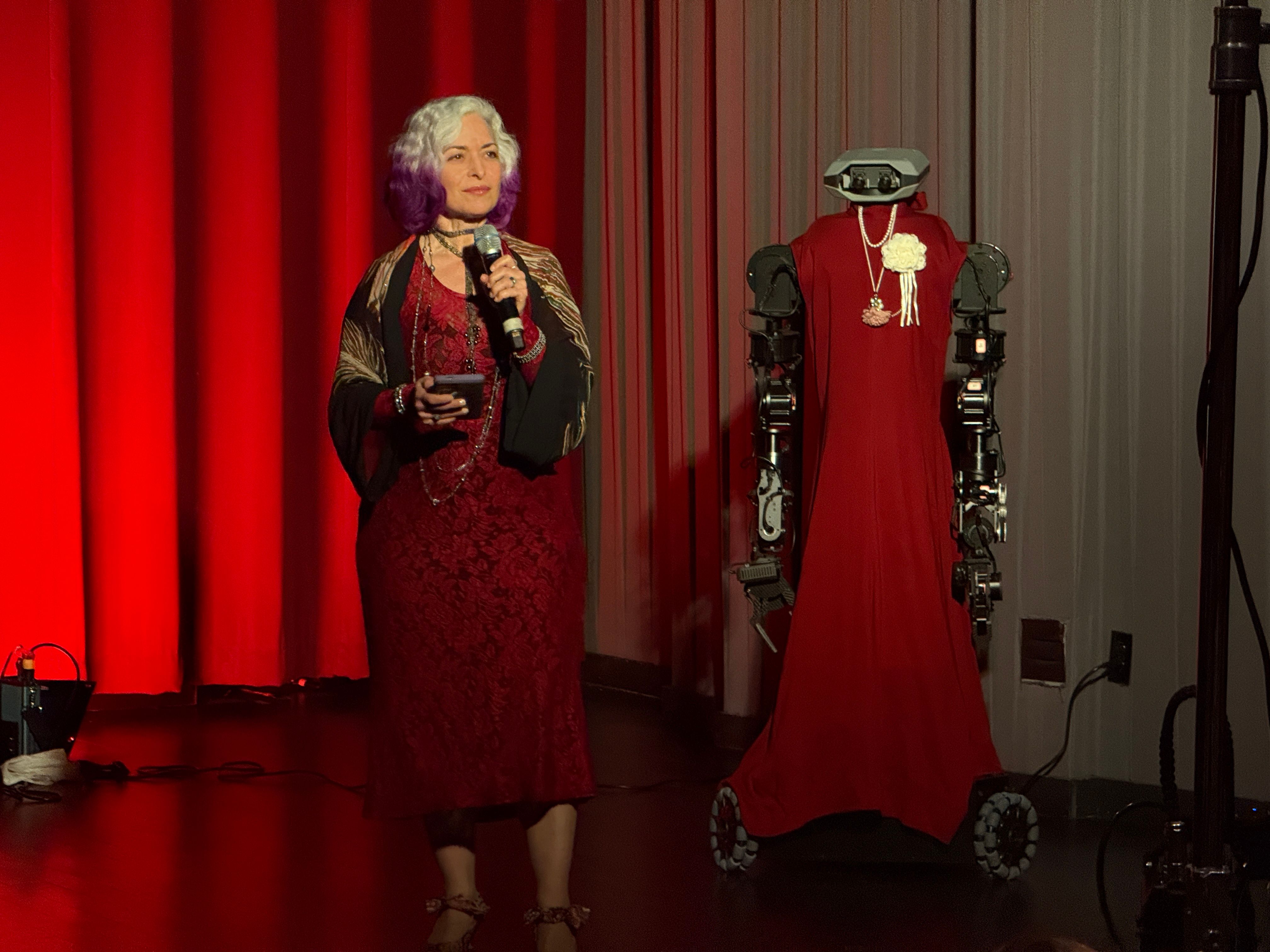 Athena Demos winning Experience of the Year for Burnersphere, next to an unrelated robot.